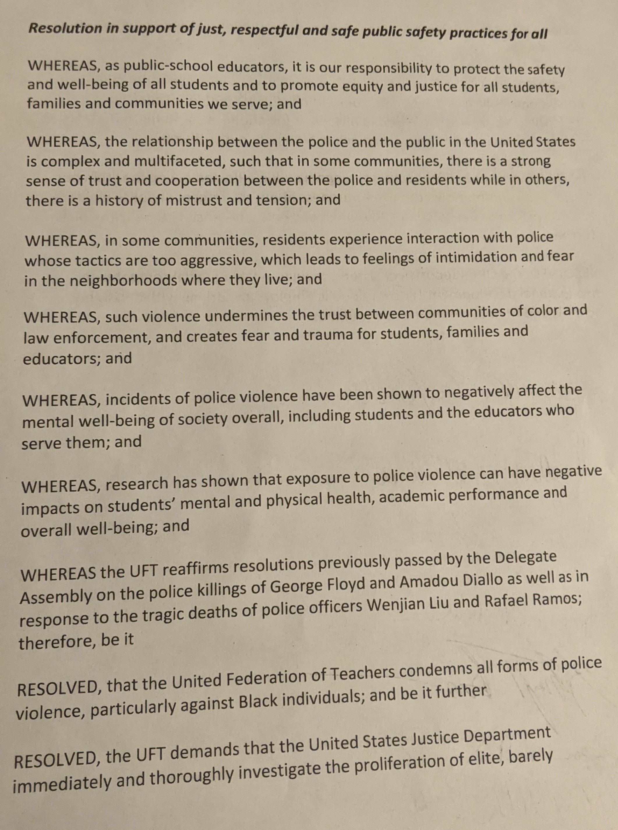 Amy Arundel: Stand in favor of resolution. Appreciate the way it’s written in a way that addresses that UFT members have police in families. But we need to talk about trust. There’s none where I am in East Harlem. This helps us think about things in terms of a systems instead of persons. Bring this back to your chapters.