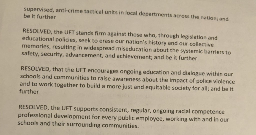 - We got a nice resolution on ending police violence. My minutes won’t do justice to the moving way in which it was motivated by speakers. Ilona Nanay (MORE/HS. Exec Board via UFC) did suggest that the resolution could have gone further – especially in terms of pushing to remove police from schools and increase restorative justice programs. It’s worth noting that United for Change members of the executive board (such as Ilona) are often criticized by UFT leadership for pushing ‘political’ resolutions without first sending them to Unity (i.e. UFT leadership) for their pre-authorization. However, we are not given the same courtesy in return. Indeed, this is a resolution on which many of us would have liked to add our two cents.