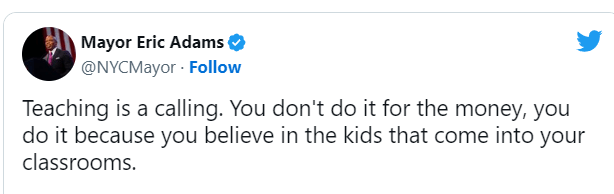 Thanks Eric Adams. And thanks UFT leadership. By not organizing for a pattern that would pay us what we deserve, you’d almost think they agreed we ‘don’t do it for the money.’ To close: A reminder that these are New Action’s contract demands. If we don’t get them in this contract, I don’t intend to vote yes in exchange for ‘timelier chump change’ and slightly less micromanagement during my C6. I intend to fight for better.