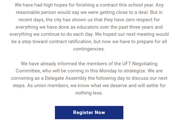 But, as the DA invite email shows below, there may not be a contract vote this year after all. This comes as a bit of a surprise. Other unions like DC37 and PBA finished bargaining in February and April, respectively. And UFT leadership was signaling just weeks ago that the City and the DOE wanted the contract done quickly as much as they did. Then, almost immediately, they started to shift that tune.