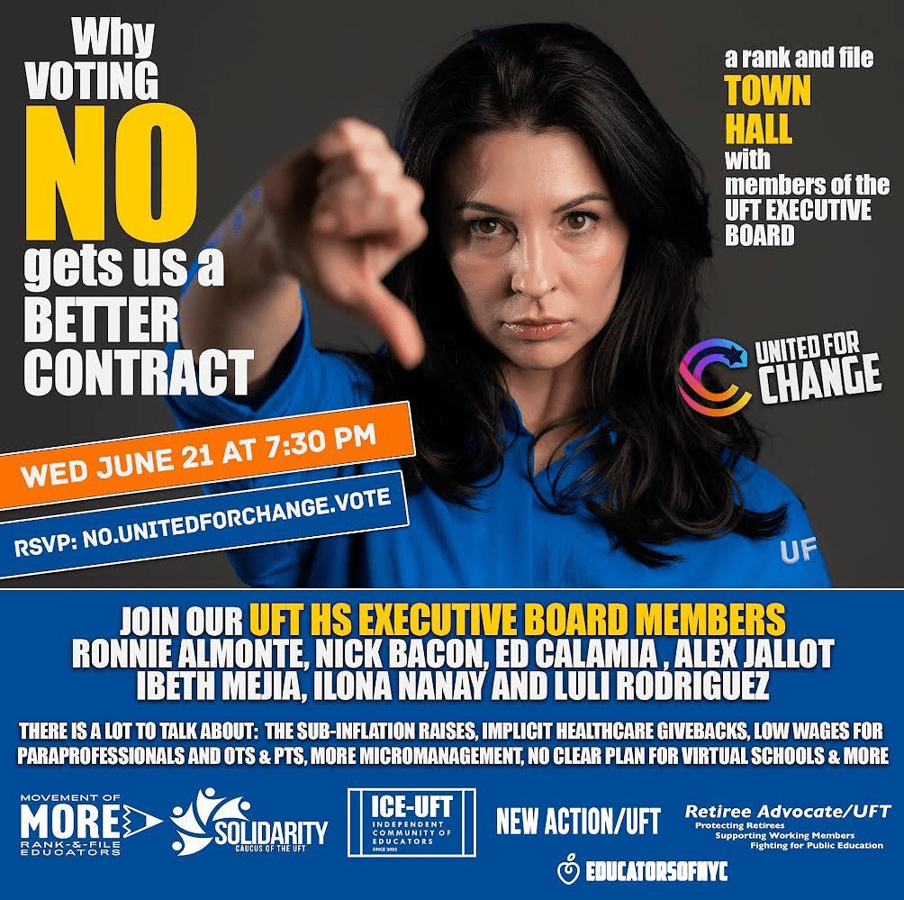 Join the UFT’s High School Executive Board, which includes members affiliated with New Action/UFT, Solidarity, MORE, and ICE-UFT, at 7:30 PM for a panel on why all of our caucuses agree/concur: voting no gets us a better deal. Register here.
