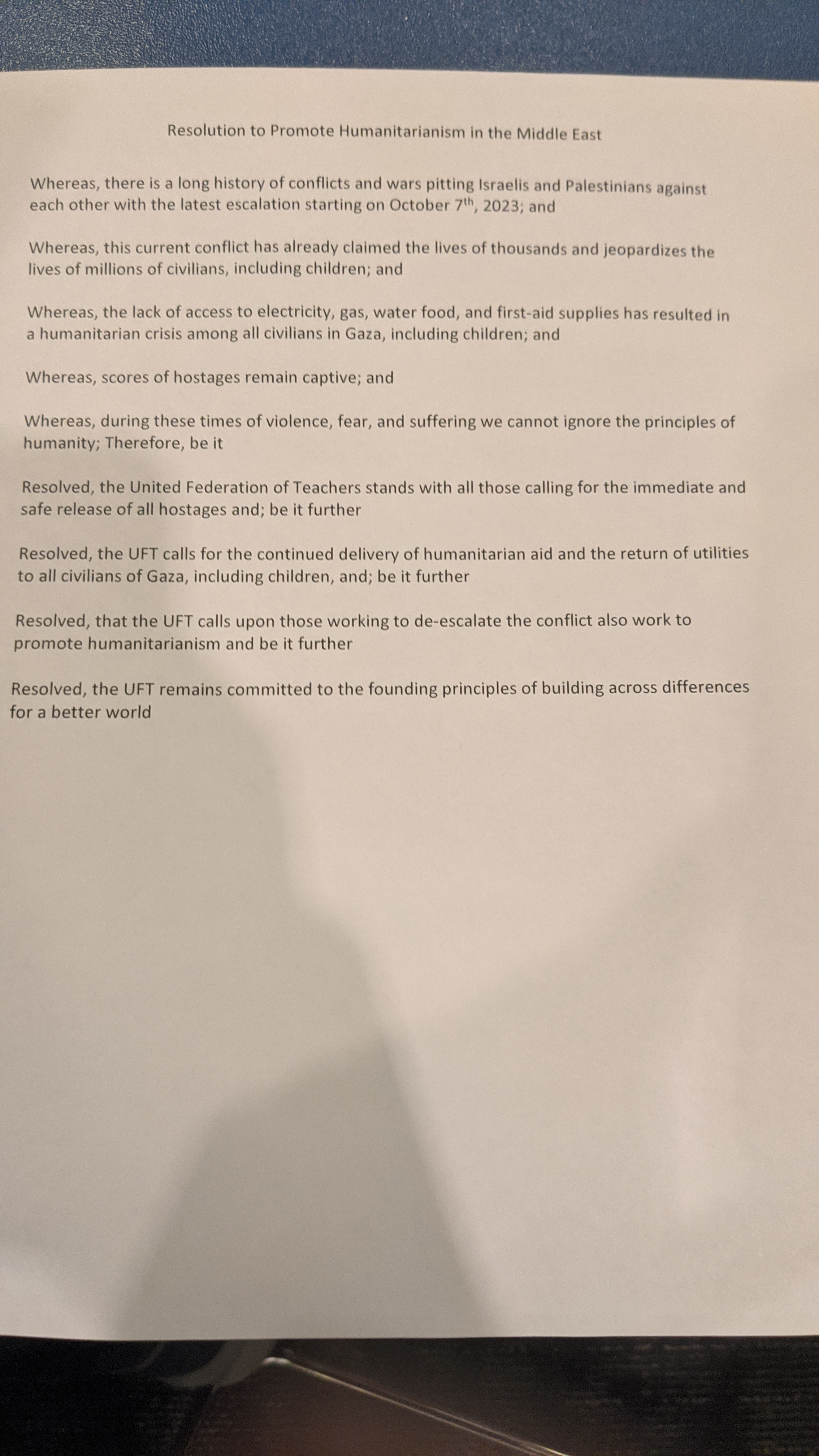 LeRoy Barr Resolution to promote humanitarianism in the middle east. They say that the Chinese symbol for crisis is a combination of two different symbols, danger and opportunity. Not an exact translation, because opportunity means change point. I start that way because the world, sometimes this union, is in a crisis. It’s a dangerous time. Also a time for opportunity or change point. I think of all the conversations I’ve had with diverse caucus members here. Diversity has always been our strength. Diversity of race, religion, all those things make us what we are. When the high schools came together with the union at that time, there was a lot they didn’t agree about, but they took an opportunity to look for the middle ground. Remember early lessons, because important today. Under union tent, in this hall. It won’t be last time that we’re at a precipice moment – we’ll be here again. Remember lessons of how got here, it’s my belief that we can get through this moment – and we can get through other moments like this. We believe in a great solid education for children that we love. We believe in good patient care. We believe in family, safety, a lot of good things that bring us to the middle. Like a ven diagram. Should focus on these things – holds us together. When we have to move we have to look to what we agree on. So this resolution is brought in that spirit, so we highlight that as well – we believe hostages should be returned, that utilities should be turned back on, that war should be de-escalated, that we can find a peaceful resolution to this conflict. We love the children, family here, we love them there too. No difference. Don’t care what side you’re on. It’s the human side, it’s humanity, it’s what’s right. Asking about what brings us together. I hope and pray that the people are under the sound of my voice tonight take that message out. We all love this union. I’ve said this Mike, Norm, Daniel, don’t care where you sit on this issue, we love diversity. Anyone who says I don’t – I challenge you, because when you bring it all in and have those discussions, the final product is battle tested. This conversation tonight is bigger than this reso – it’s about where we’re going as a union – we’re we are going as a union, a family, and I ask that you support this 100%.